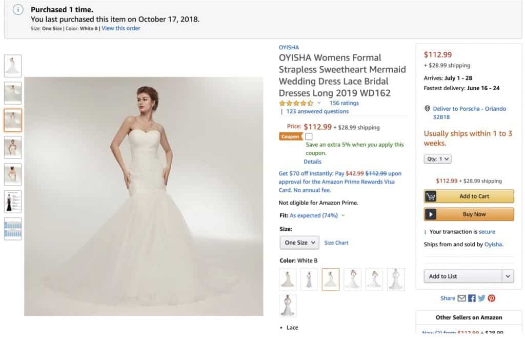 I spent so much time searching the traditional sites for budget friendly wedding dresses. Finally I decided that I was going to try something daring.. I was going to buy my dress on AMAZON! It was $100 and they said they “custom make it to your measurements” so I figured I wouldn’t have to pay for alterations. I read every single review, looked at every single photo, and finally decided to just do it. If the dress was horrible, I was out $100, but if it wasn’t I was going to save hundreds. Once Stephen heard the price I knew I scored some leverage for other items.